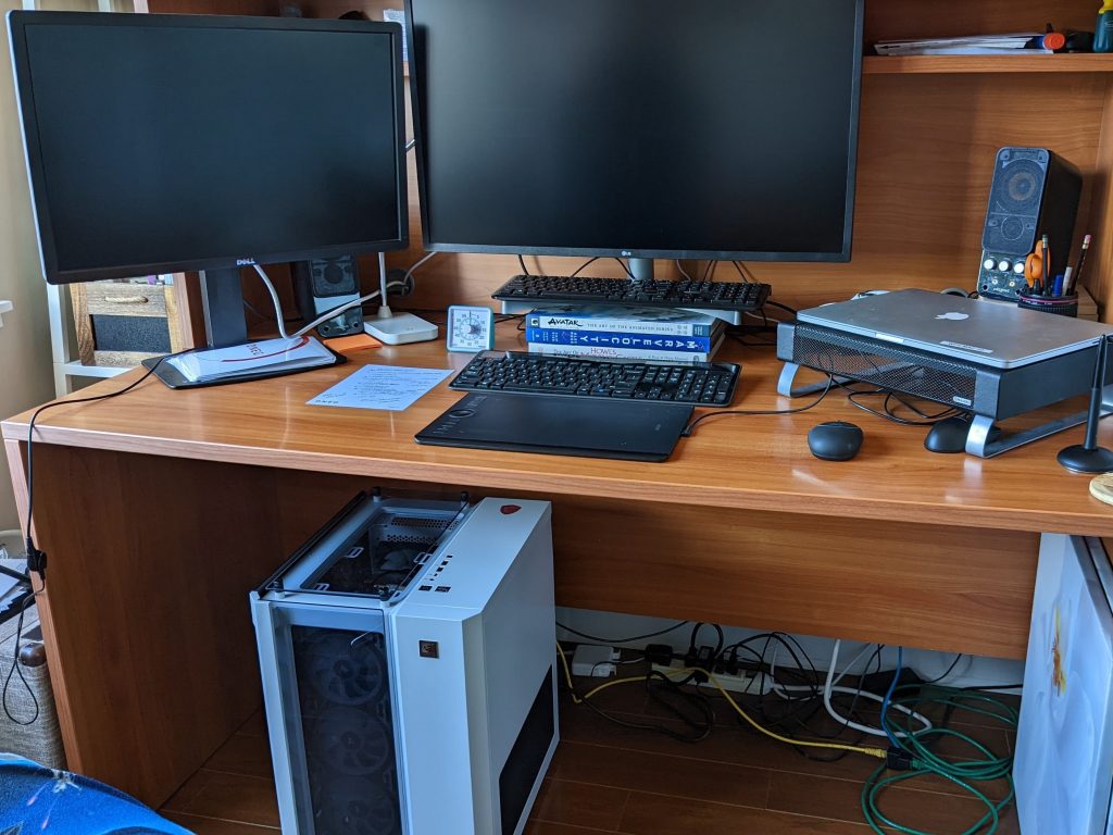 Photo Note: My Home Office in 2022 – Work Macbook on a stand connected to 1 monitor and personal PC connected to both monitors. Don’t worry: my setup became less cluttered afterwards as you’ll see in future posts.
